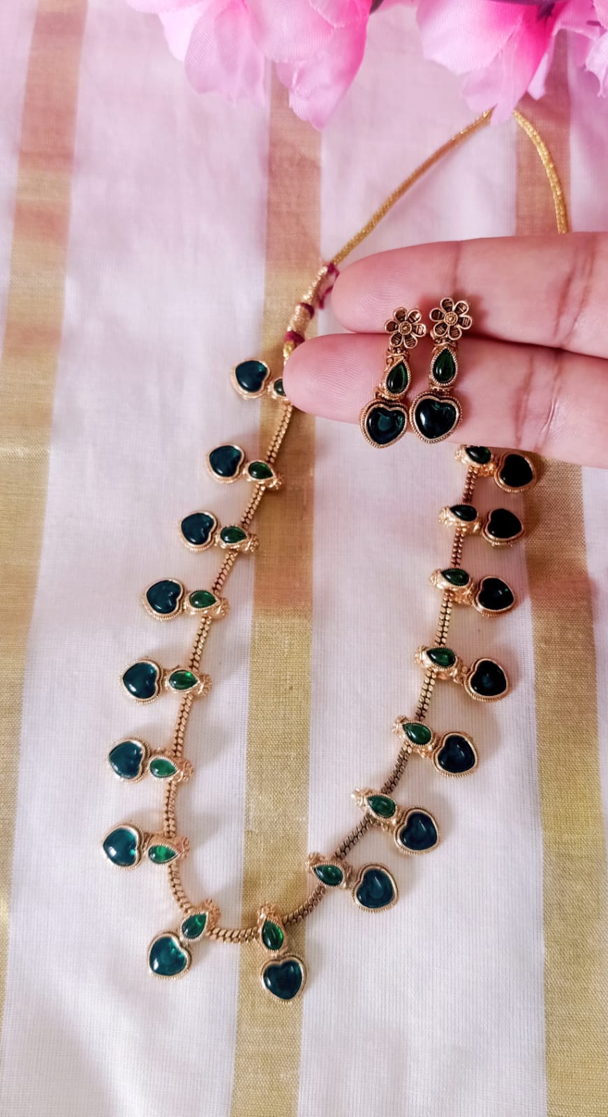 Green Heart Kemp Necklace Set – Antique Gold Finish